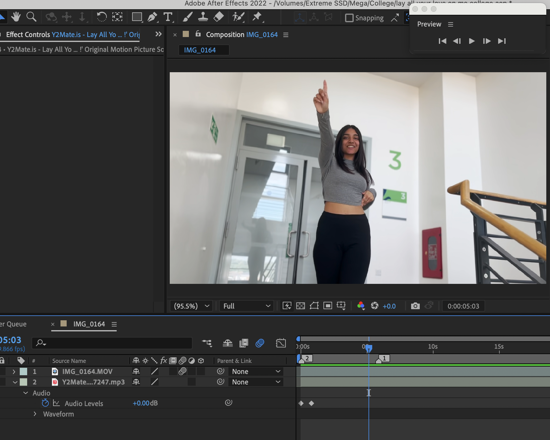 On certain parts like the end I faded the clip out using opacity. To do that I made a keyframe half way through the clip at 100 and then at the end have a keyframe at 0. This fades the clip out. I wanted the music to fade out with the clip as well, which basically means I did the same thing but with bypass levels. What I found though was I had the levels on -20 already cause I found them really loud. So at the same point as the other clip I had a keyframe at -20 and then at the end of the music track I made a keyframe of -80 since that will defiantly reduce the sound enough.
