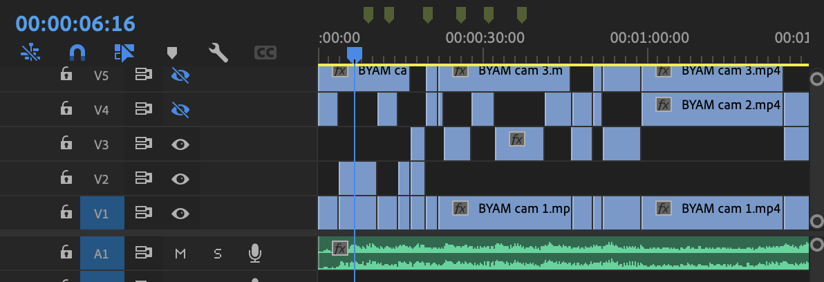 First I started by adding the audio tack to the timeline and then adding one of the video angles above and synchorizes them together so it plays in time. I did this by highlighting both tacks and right clicking and finding the synchronize button. Once on this menu I made sure I pressed audio so it only synced the audio. I repeated this with the two other angled clips until I had 3 angles all synchronized to the music track.