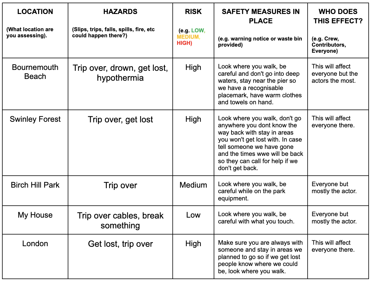 The risk assessment is helpful as it gives you an idea of what to look out for when filming. This way we can be safe and finish the filming with no problems related to our safety. I find that writing this out before hand allows me to get a better understanding for the location as I am thinking of it in a safety way instead.